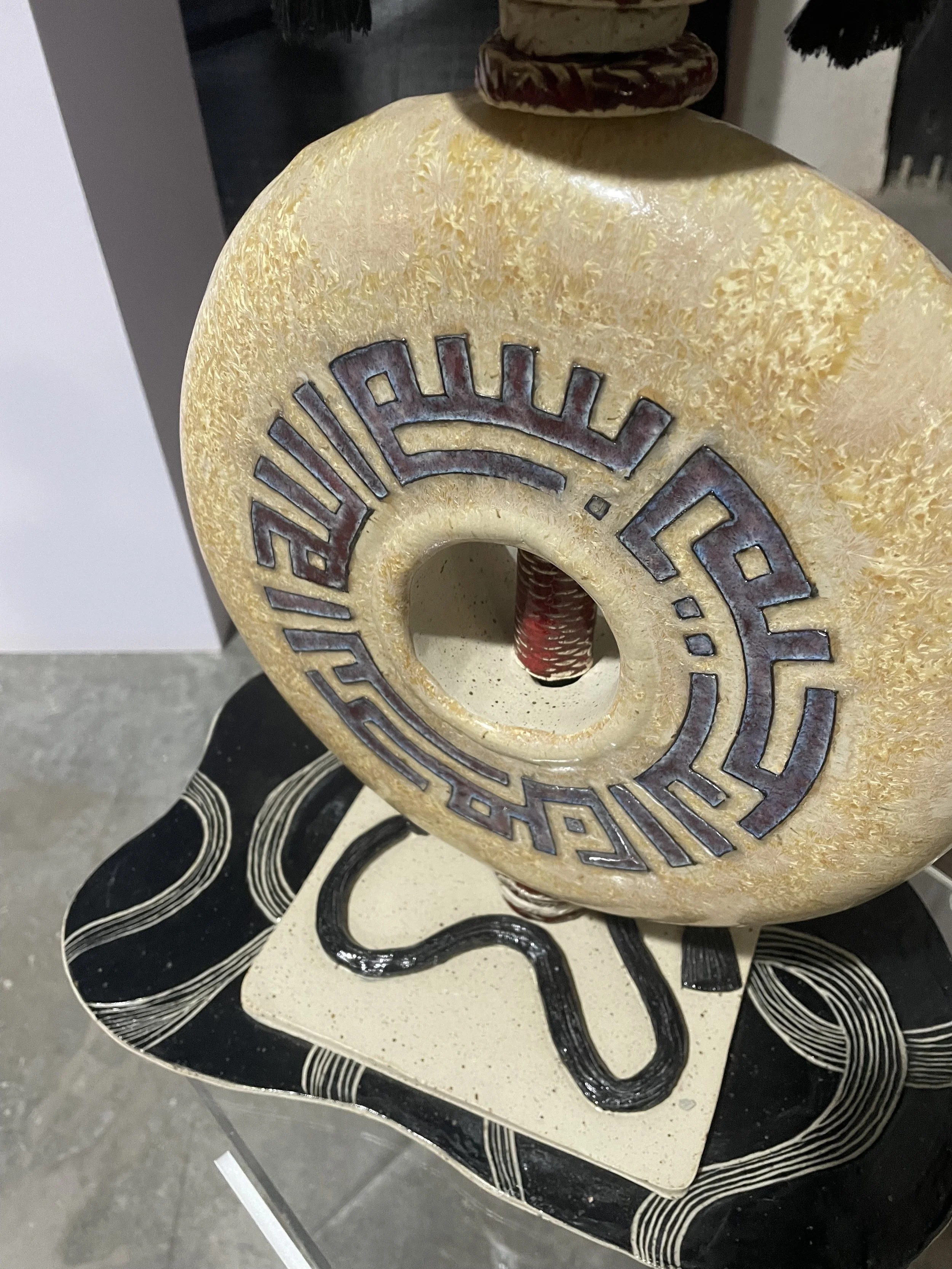 Rachel’s totem was a wonderful demonstration in her skillful use of underglaze applied onto dark clay body- a technique that shows up often in her body of work. You can see similar techniques, as well Rachel’s recent work with wax resist on her Instagram @rachelceramics, or ra.