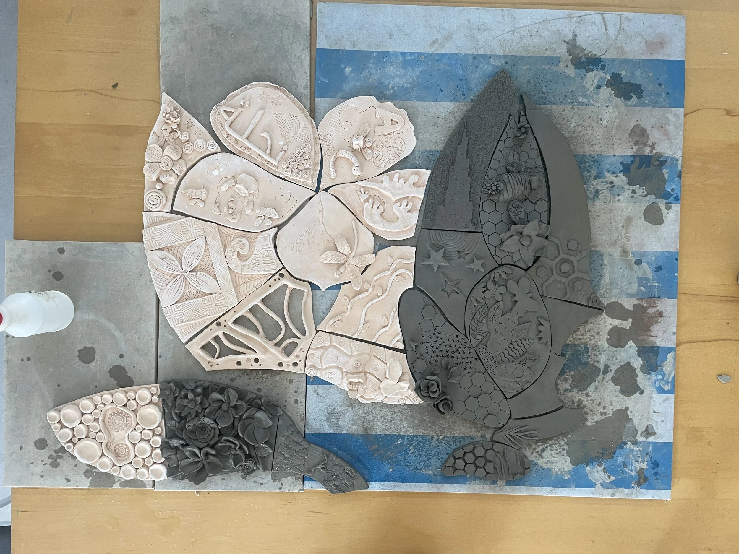 Once we had the elementary tiles completed, the next step was to combine them with the larger hexagonal tiles for a unified design. For this, high school students enrolled in the CDI: 3D (Ceramics and Sculpture) course were on task. Nearing the end of the semester, these students were well versed in clay, and were asked to work collaboratively to design the tiles with effective composition in mind, and the intention to highlight and celebrate the Year 2 tiles.