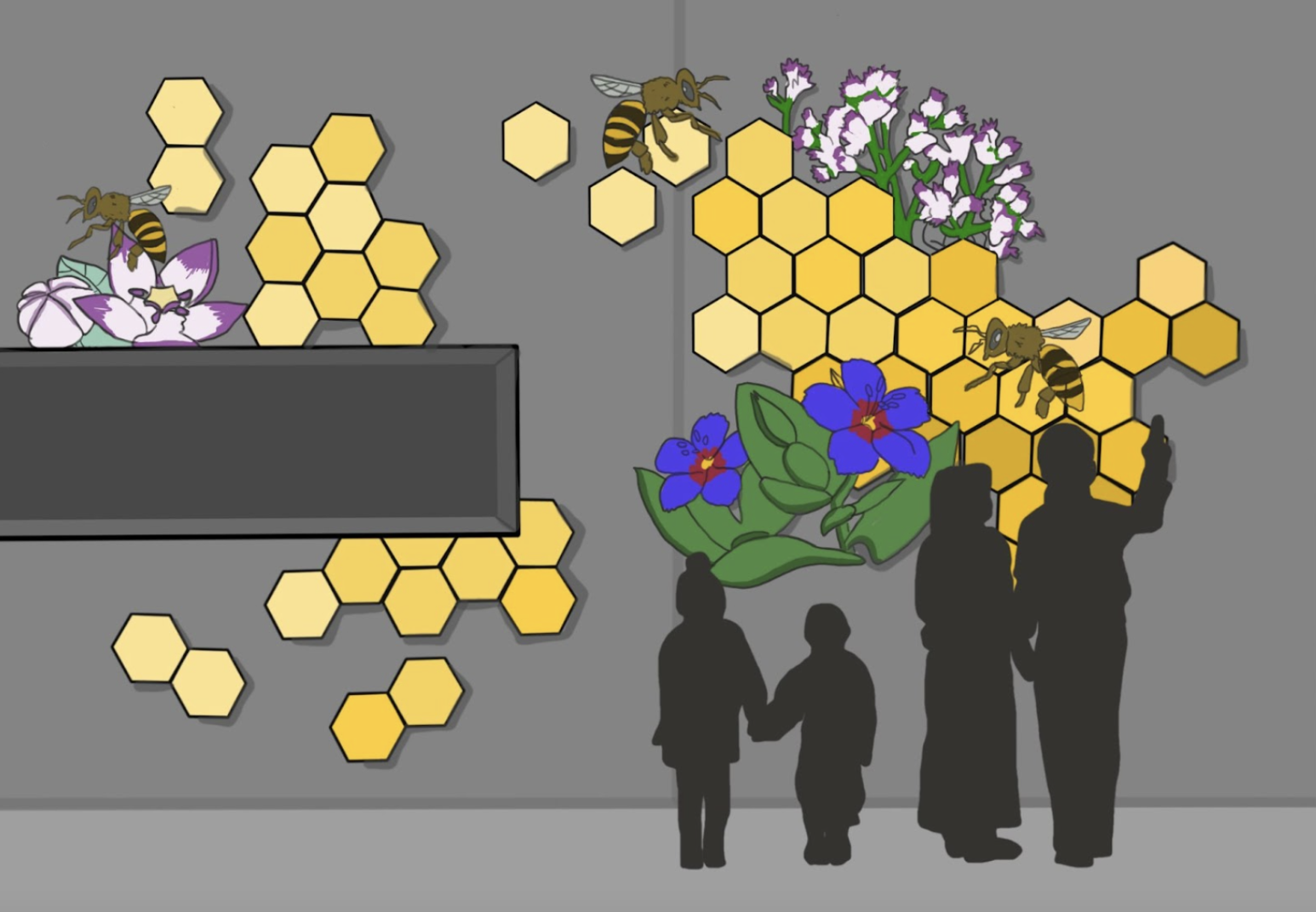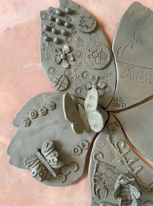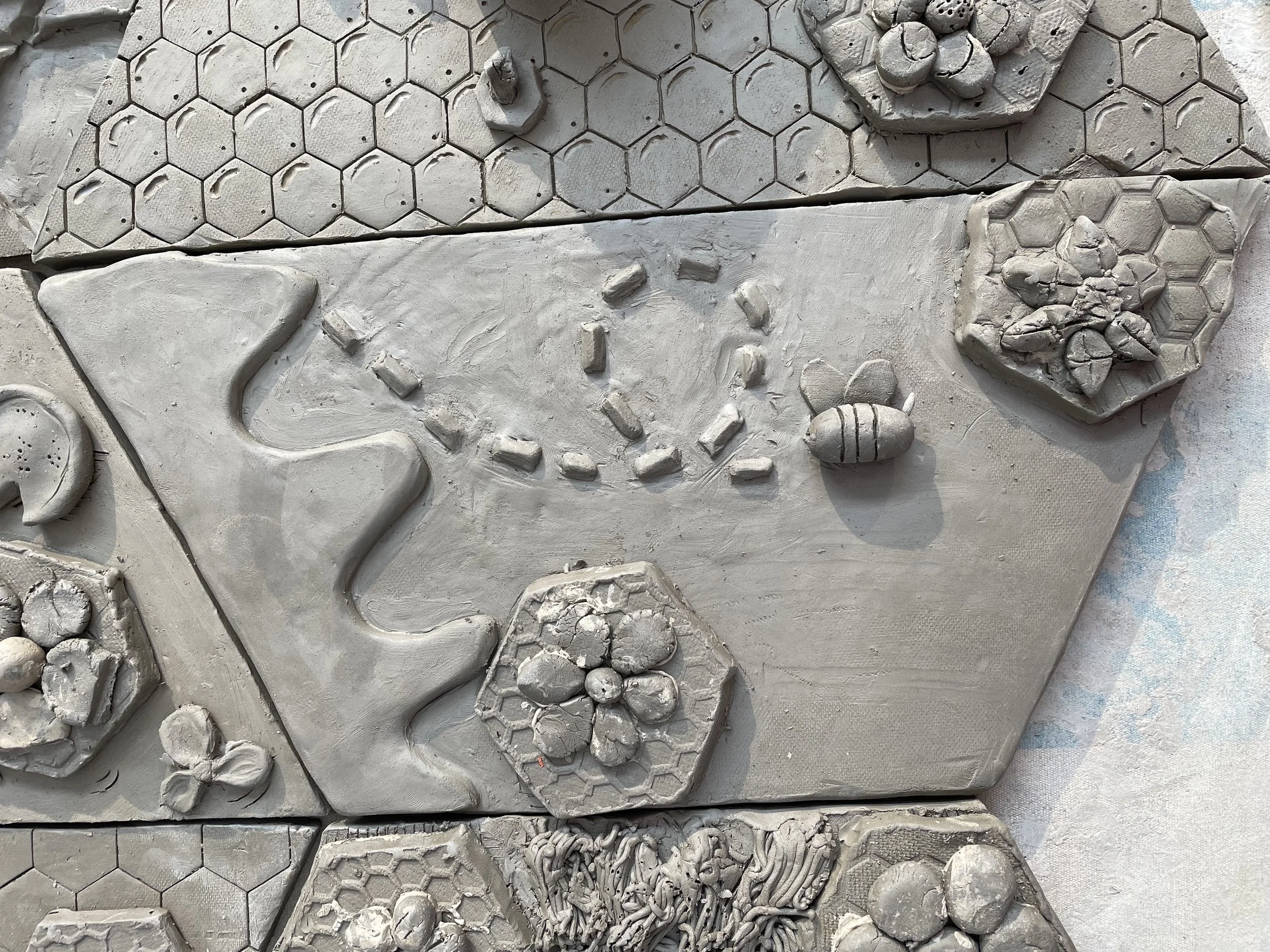 The art teachers led the ceramics lesson with their classes in December, focusing on the construction of mini hexagons which would then be attached to the larger hexagons featured in the mural. The Year 2 tiles showcase both bee or floral inspired design. With 100+ students in Year 2 this was a fantastic idea to make this project accessible to a whole grade-level ,and produced some lovely ti thanks to Anna Griffith for conceptualizing this.