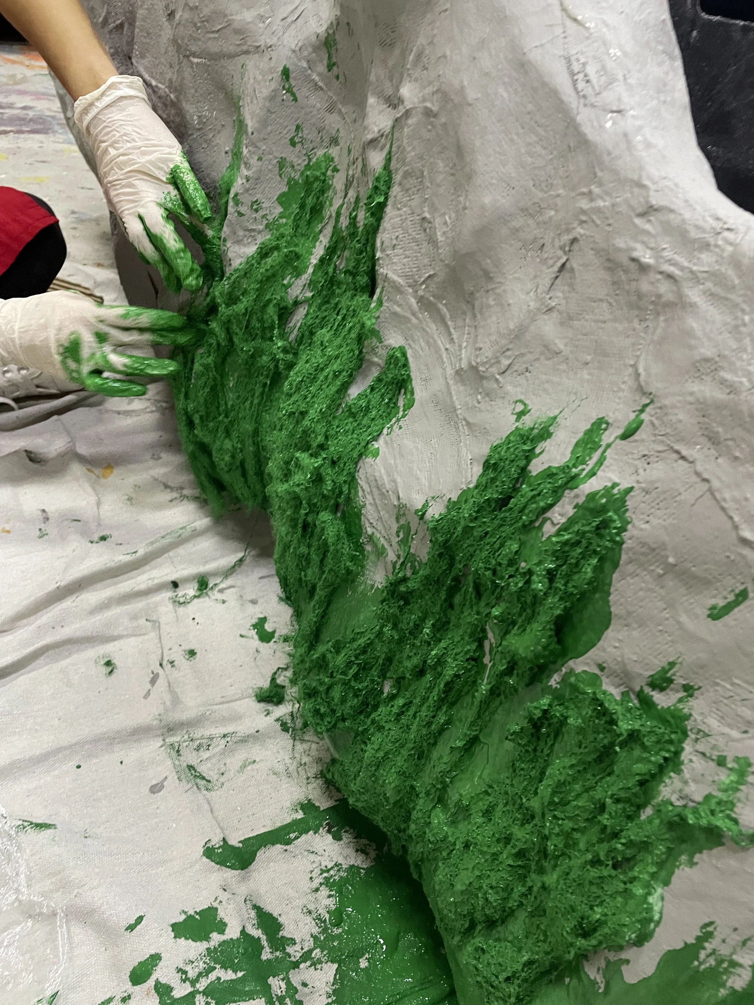 Conveniently the backside of this element was open, making it perfect for the lair- allowing us to create a cave-like structure with some thin plywood and insulation foam at the foreground- adding some physical depth. On the front of the grotto, we added some shelves, and later bulked them out using scrap papers, and plaster cloth in order to transform them into a coral-like base.