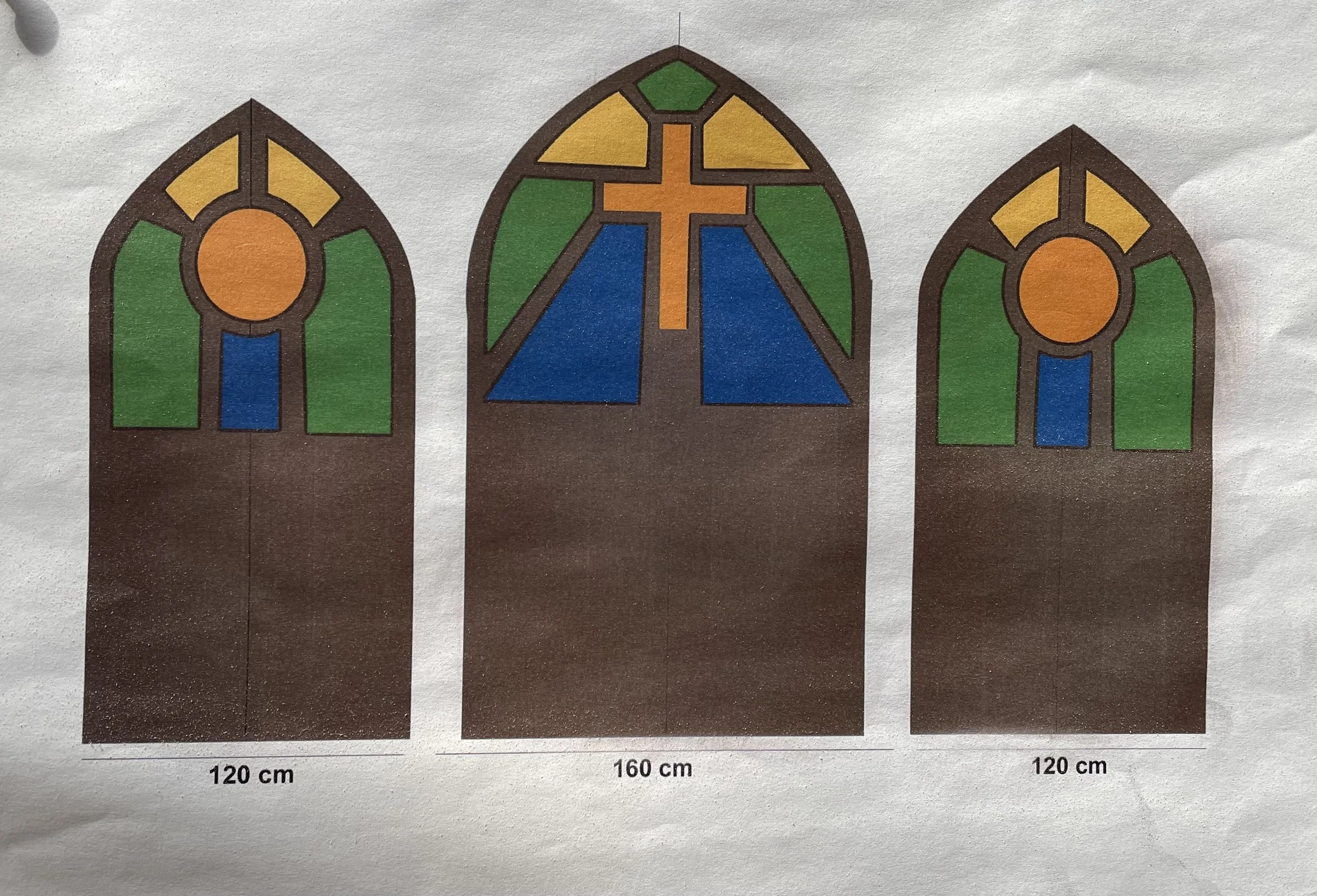 Fans of previous ASD productions may recognize a familiar pair of chandeliers on stage as well as the windows from the palace scenes. The chandeliers were constructed during last year’s Chicago production, and perfectly fit the atmosphere of elegance that we were aiming for in Prince Eric’s palace. These were used without any alteration, and as you may notice, the red curtain was kept in the same position from the year prior. Meanwhile, the windows were once the church doors used in the 2021 production of Footloose (below right). These required only a slight modification in the removal of the stained glass, the opening of an additional bottom panel, and finally adding in a gradient '“sky” to break up the black backdrop of the palace wall.