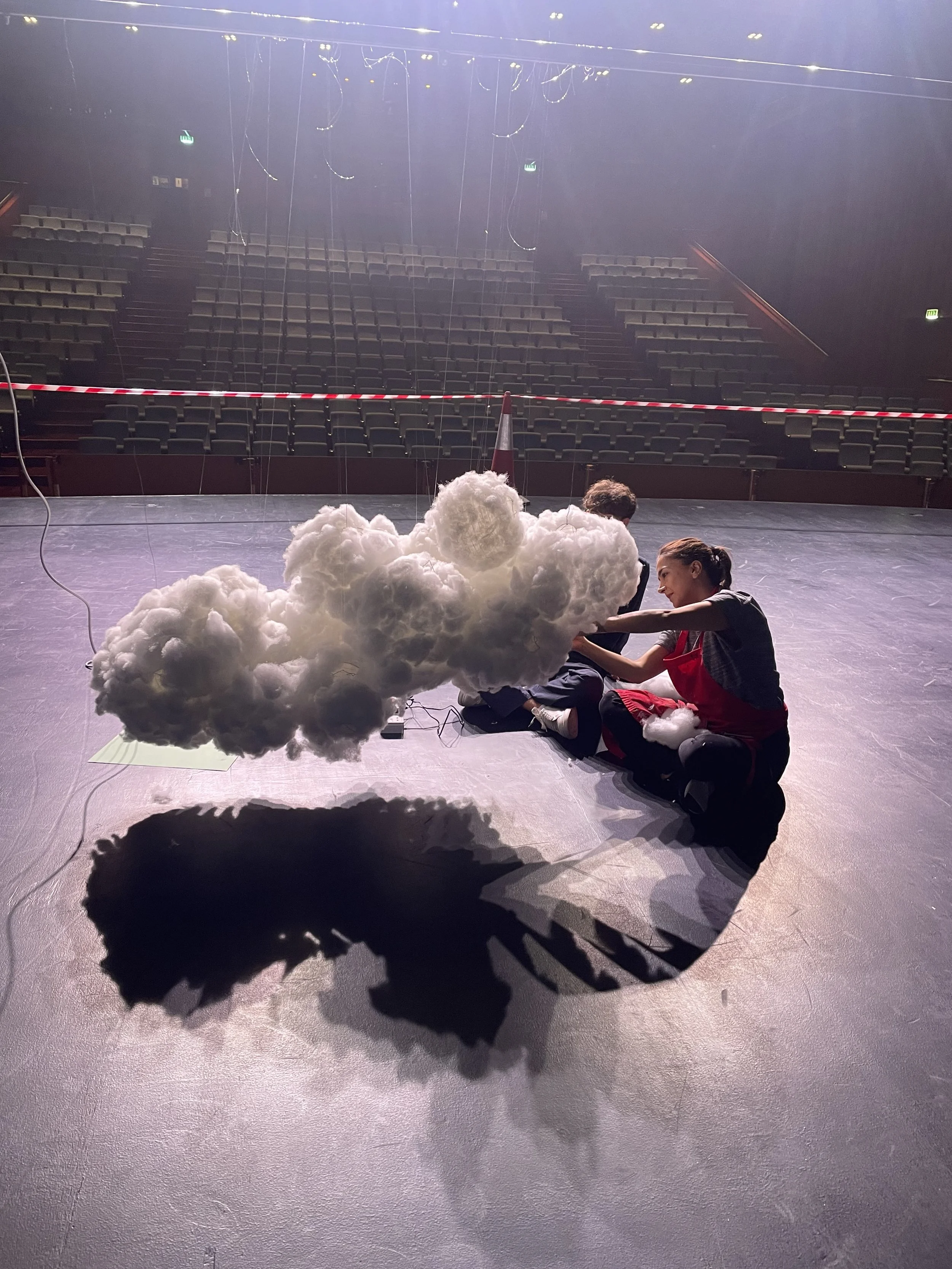 One key approach we took to differentiate between the underwater / land scenes were in a number of elements suspended from the batons. Above water we created a grouping of clouds like the one seen in the cover image, and for all underwater scene we had staggered jellyfish and bubbles.